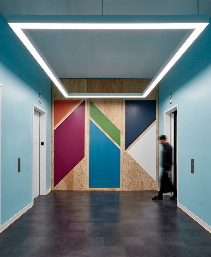 Our client wanted each floor of the building to have a separate identity, while at the same time working together as one cohesive unit. The interconnecting stairs furthered the need for a unified design, hence the simple, brightly colored graphics drawing all the floors together.